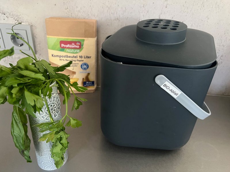 Für den Bio Müll haben wir einen anthrazitfarbenen Stöckli Pot mit Deckel für Sie bereitgestellt. Eine kompostierbare Tüte liegt auch bereit. Durch den Filter kann Feuchtigkeit entweichen, der Müll ist aber gut verräumt.